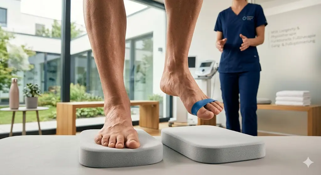 Im Zentrum stehen Übungen zur Kräftigung der Fußmuskulatur und zur Optimierung des Gangbildes. Ziel ist die Verbesserung der Fußfunktion, Stabilität und Beweglichkeit sowie zur Prävention von Beschwerden, die sich auf den ganzen Körper auswirken können.